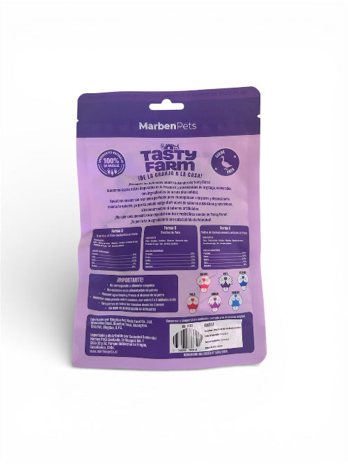 Haz que tu perro disfrute de un snack único y delicioso con los Trutitos de Pato con Huesito de Calcio 100 g Tasty Farm. Estos sabrosos trutitos están hechos con carne de pato 100% natural, acompañados de un huesito de calcio que ayuda a fortalecer sus huesos y dientes. La combinación de proteína de alta calidad y calcio esencial convierte a este snack en una opción perfecta para mantener a tu mascota activa, saludable y con una masticación adecuada.